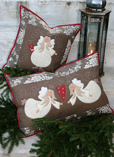 Myke puteengler. Disse flotte putene er også et AnnAKa design- og jeg tror jammen jeg har en stoffpakke liggende på syrommet som skal bli et par engleputer også jeg.... De kommer nok til å bli fine sammen med nisseputene jeg sydde i fjor av "Hjertelige nissevenner" mønsteret. Vi har stoffpakker til disse putene i butikken, så bare ring eller send en mail hvis du ønsker en pakke.